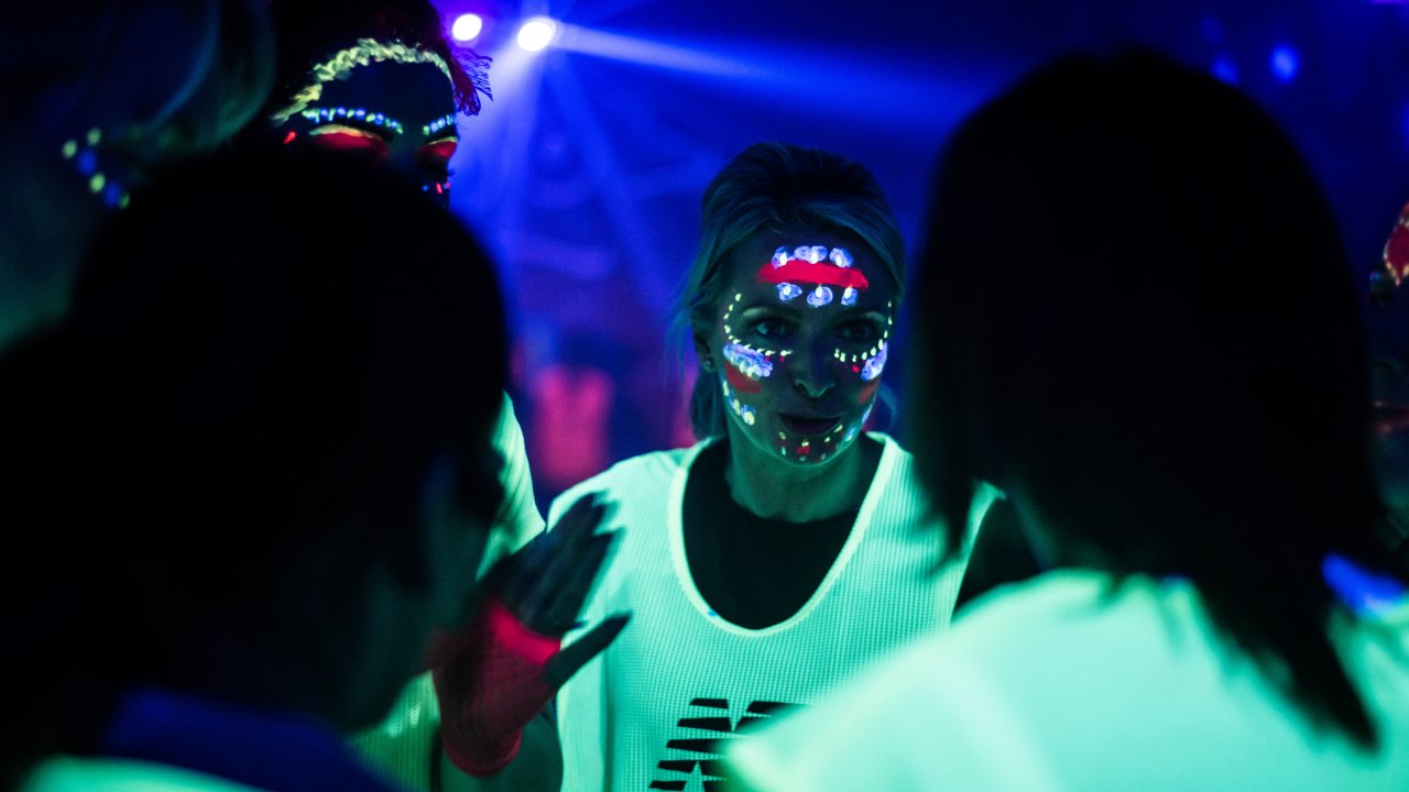 A fully neon-lit sports hall that instantly transforms into a glow-up party.