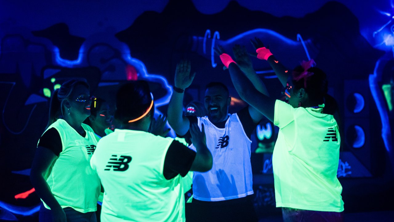 A fully neon-lit sports hall that instantly transforms into a glow-up party.